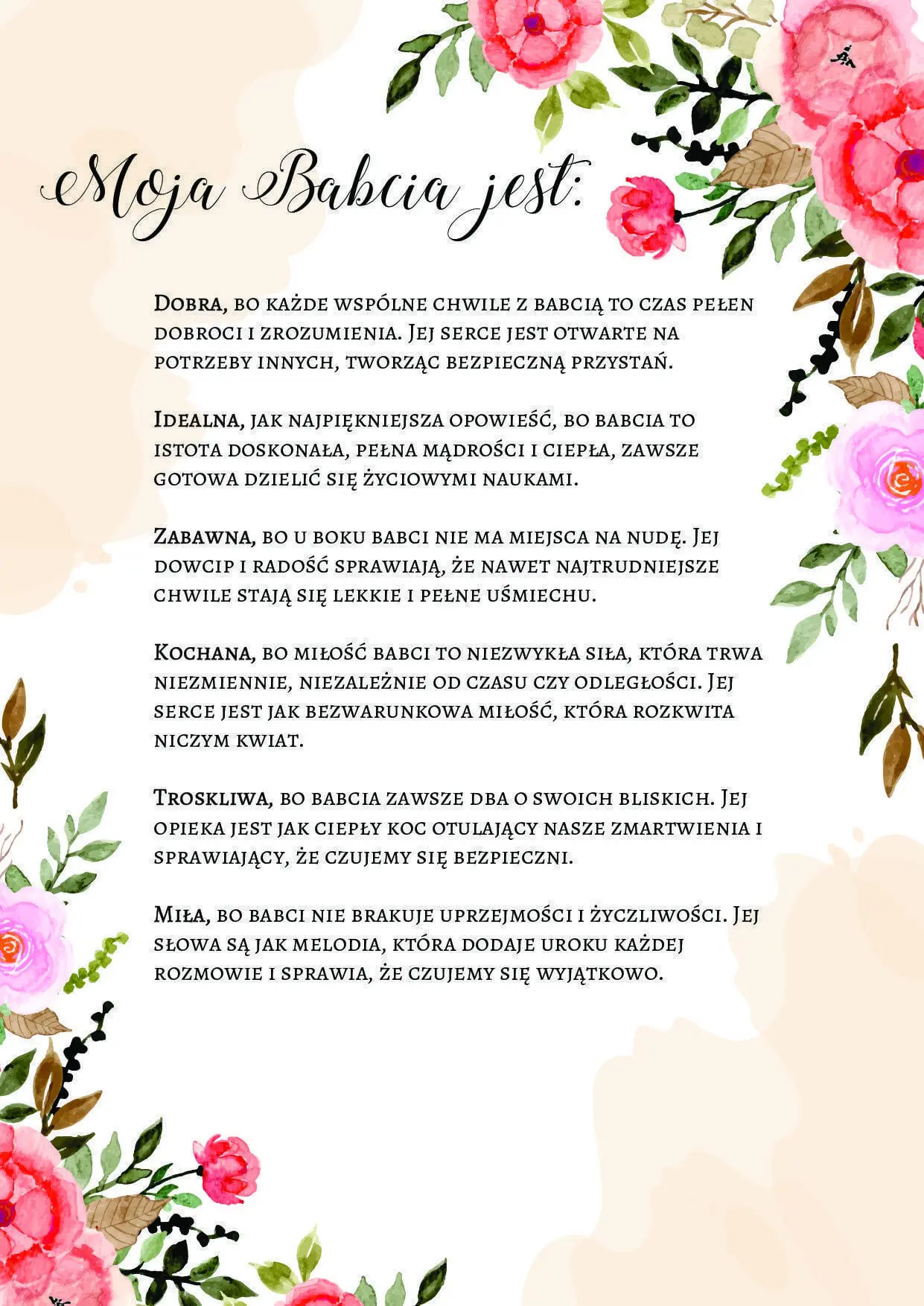 Troskliwa, bo babcia zawsze dba o swoich bliskich. Jej opieka jest jak ciepły koc otulający nasze zmartwienia i sprawiający, że czujemy się bezpieczni.